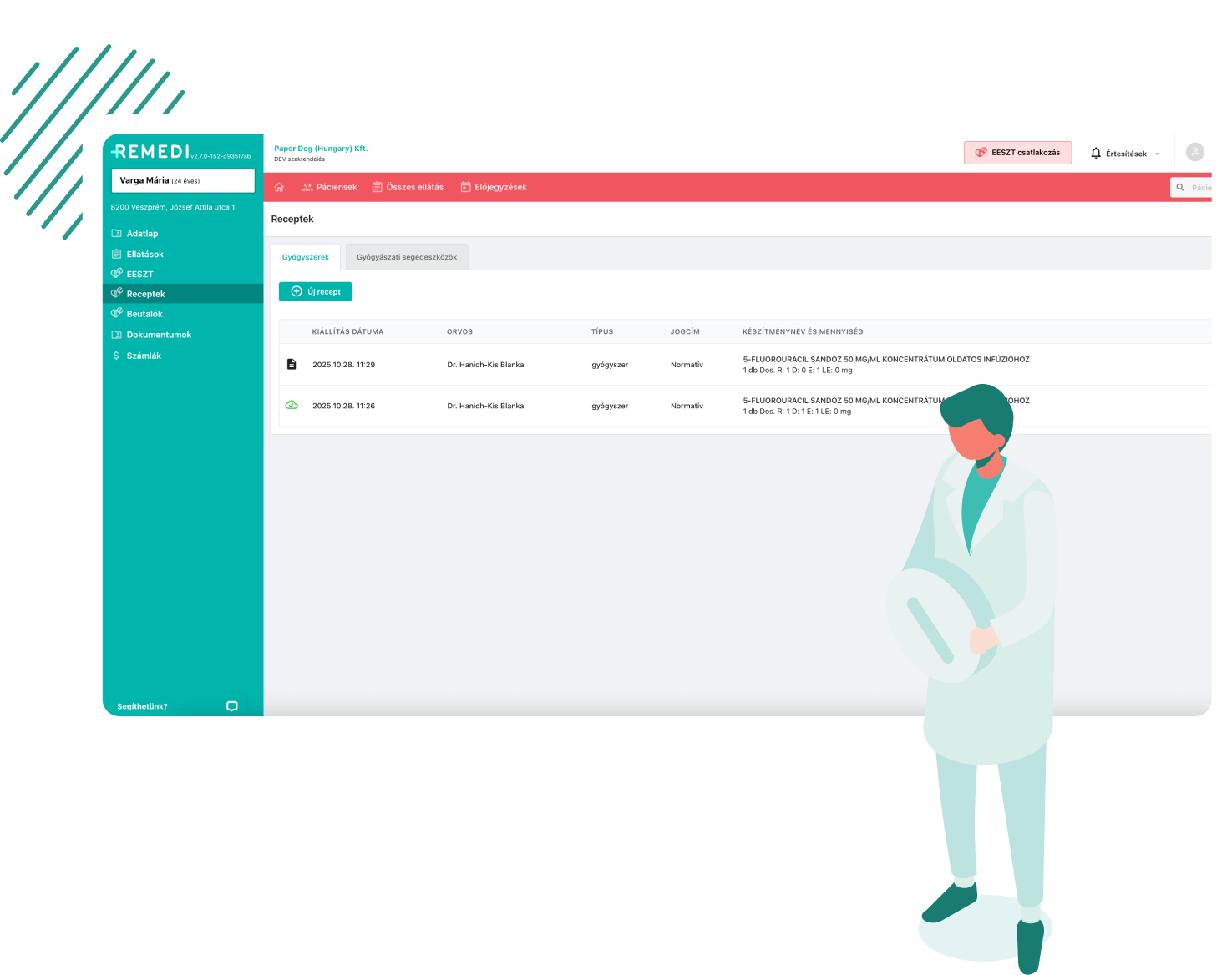 A rendszer tervezésekor elsődleges célunk az volt, hogy a vényírás folyamata a lehető leggyorsabb és legegyszerűbb legyen. Az áttekinthető, intuitív felhasználói felület segítségével az orvosok - akár új felhasználóként is - könnyen eligazodnak a rendszerben, így a receptírás gyorsan, hatékonyan és pontosan elvégezhető.
